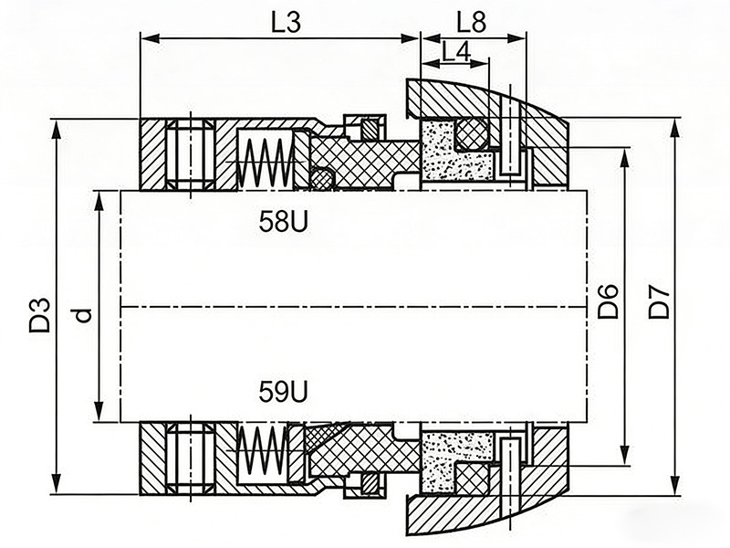 The 58U/59U mechanical seal is a compact multi-spring single seal with a non-balanced design and bidirectional rotation. It offers stable sealing performance under high speed and moderate pressure, making it suitable for oil, water, organic solvents, and other corrosive media in various industrial pump systems.
